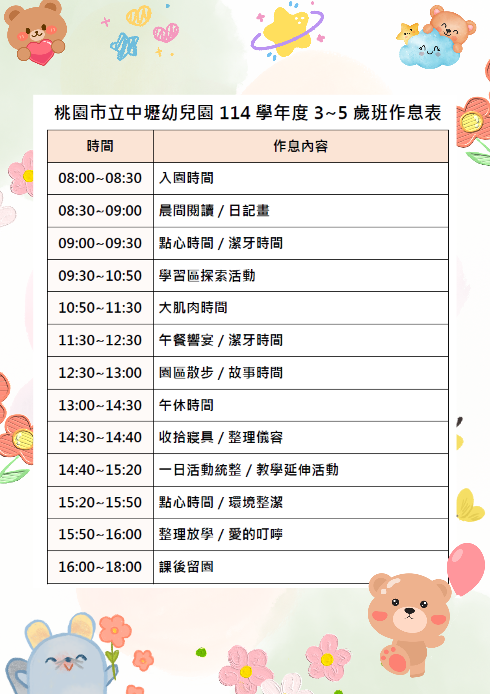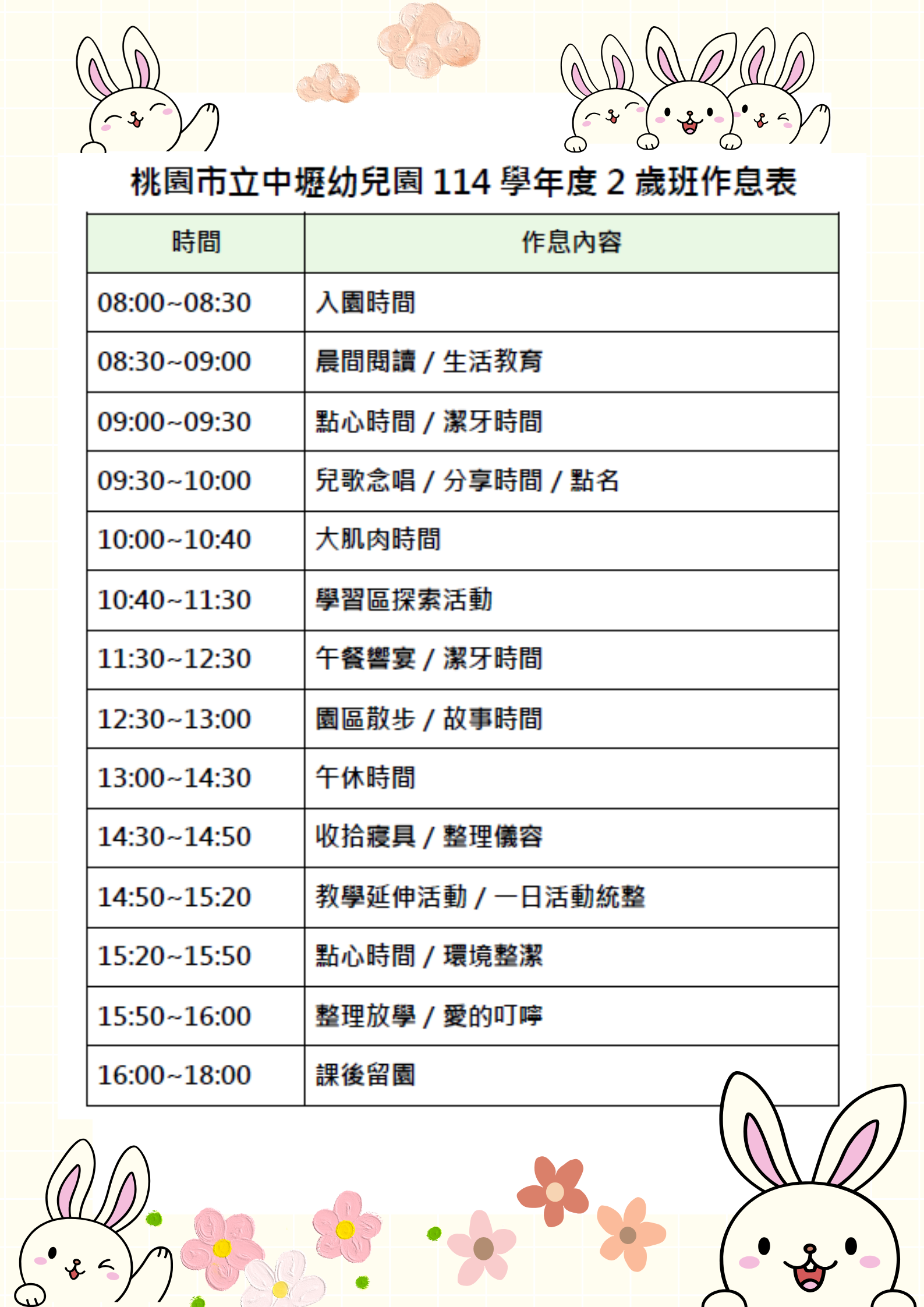 (一)收托對象: 滿2-6足歲入國小學齡前之幼兒,3足歲幼兒俟園所第一及第二階段招生後有缺額時再行開放登記。 (二)收托時間: 每日上午7:30-下午4:30。 課後留園:下午4:00-6:00