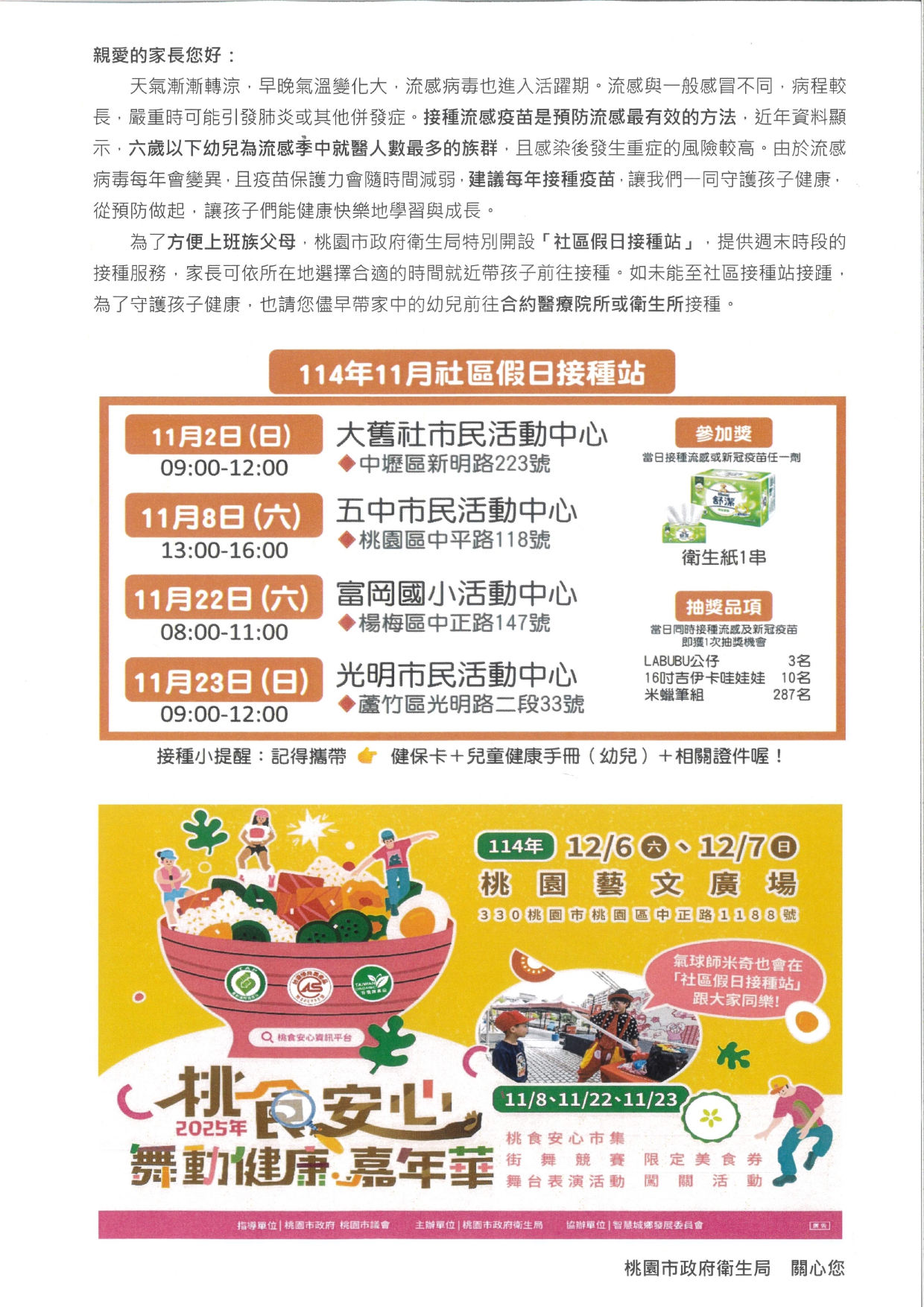 轉發「給家長的一封信」宣導幼兒 接種公費流感疫苗