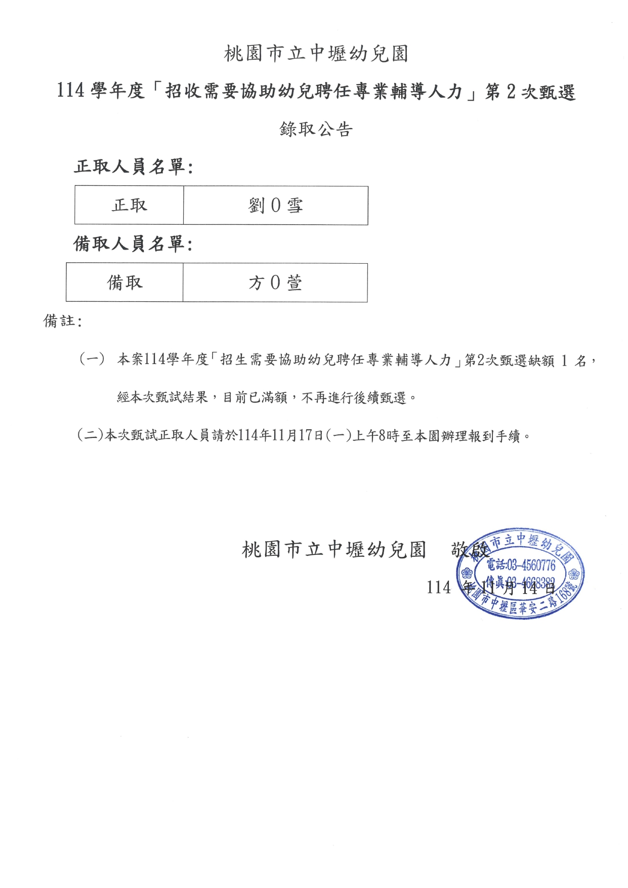 桃園市立中壢幼兒園114學年度「公立幼兒園招收需要協助幼兒聘任專業發展輔導人力」第2次甄選錄取公告