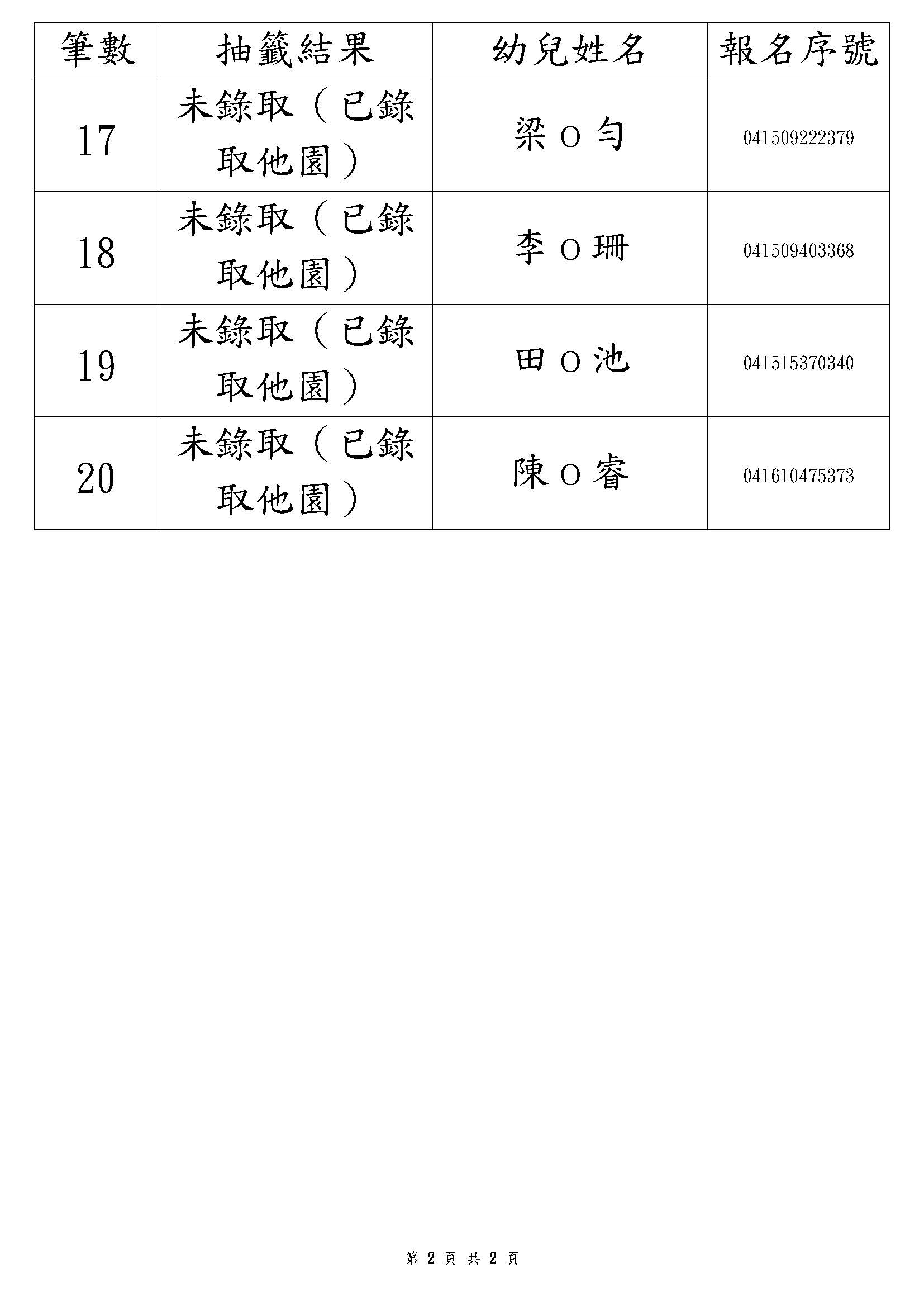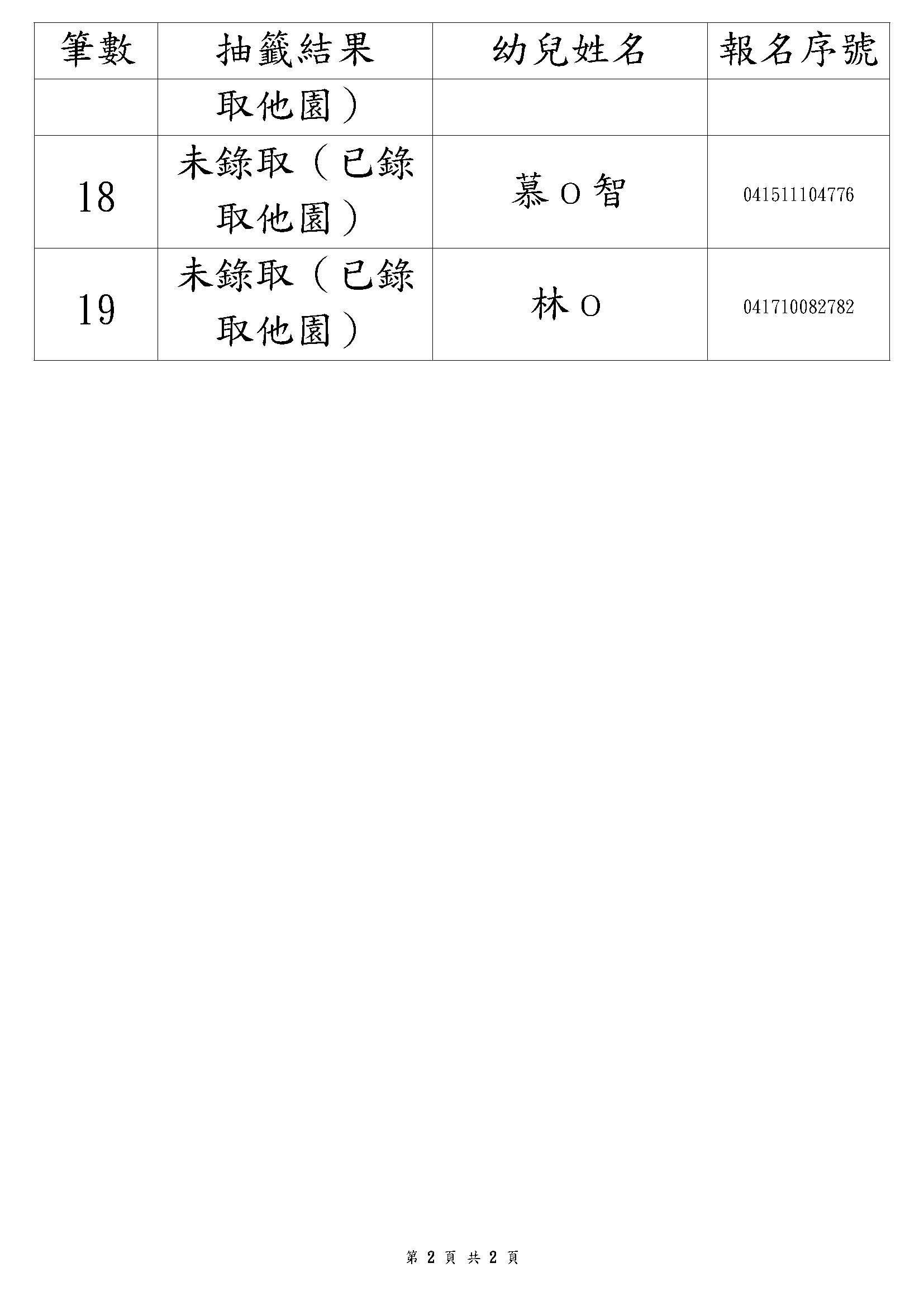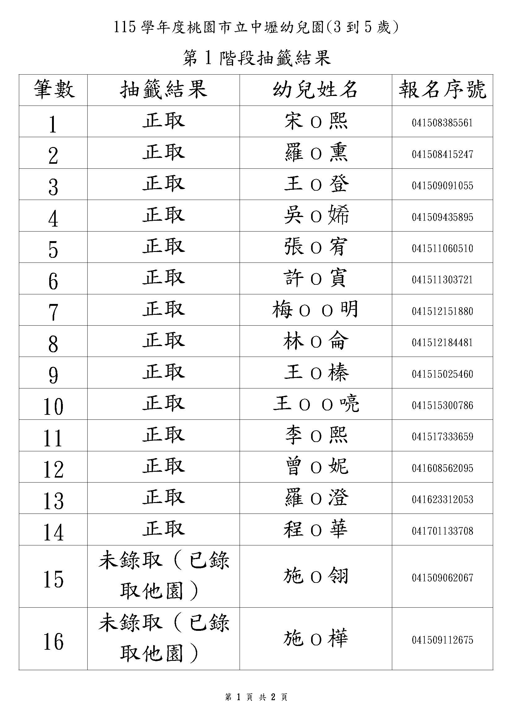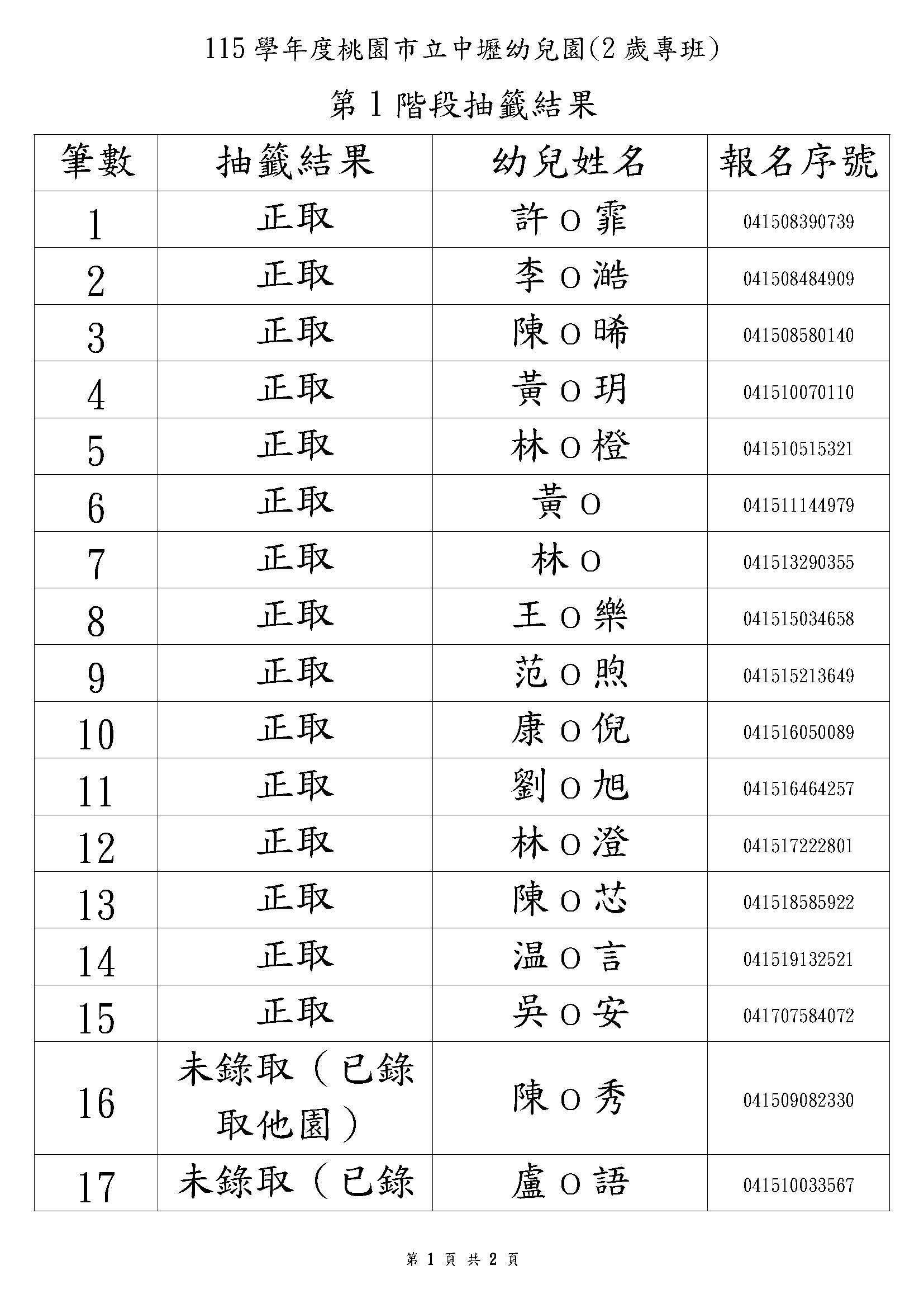桃園市立中壢幼兒園第一階段抽籤結果(2歲專班)
